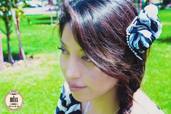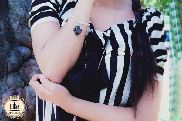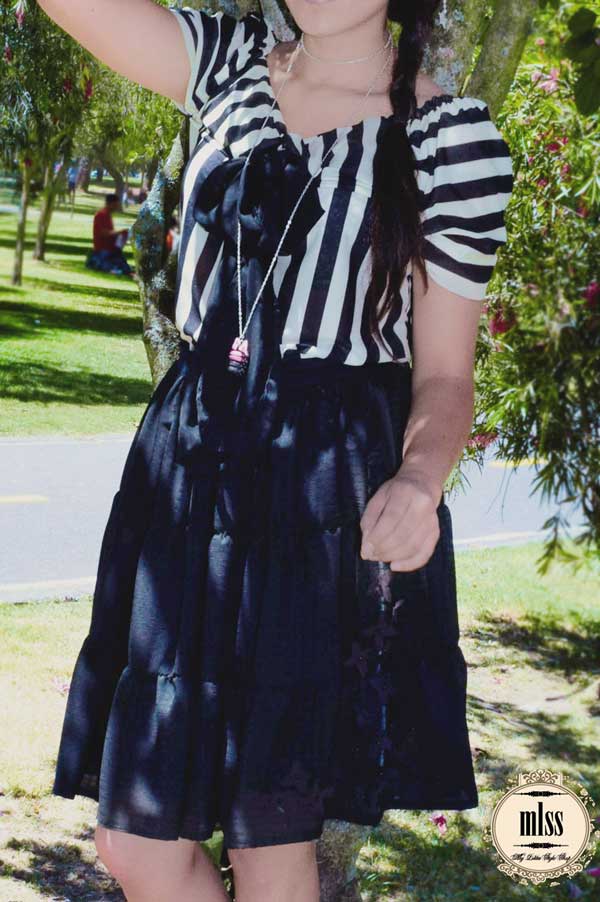 Una blusa de material ligero (chiffon) con rayas verticales color negro y crema combinada con una hermosa falda en color negro también del mismo material y accesorios sencillos que combinen con la sencillez y dulzura de este conjunto