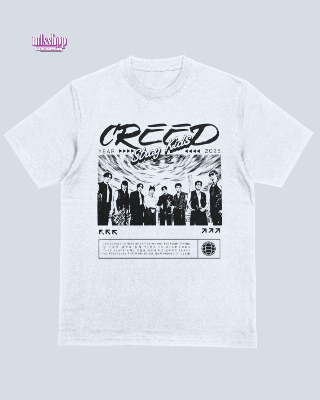 Descubre la camiseta “CREED – Stray Kids” una prenda diseñada para los verdaderos fanáticos del K-Pop. Con un impactante diseño que rinde homenaje a la icónica banda y su próximo año, esta camiseta es la forma perfecta de mostrar tu amor por la música.